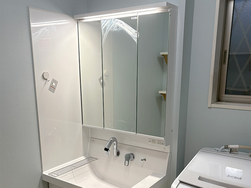 洗面台の壁に水拭き可能なマグネット対応パネルを施工し、清掃性と利便性の高い洗面空間になりました。